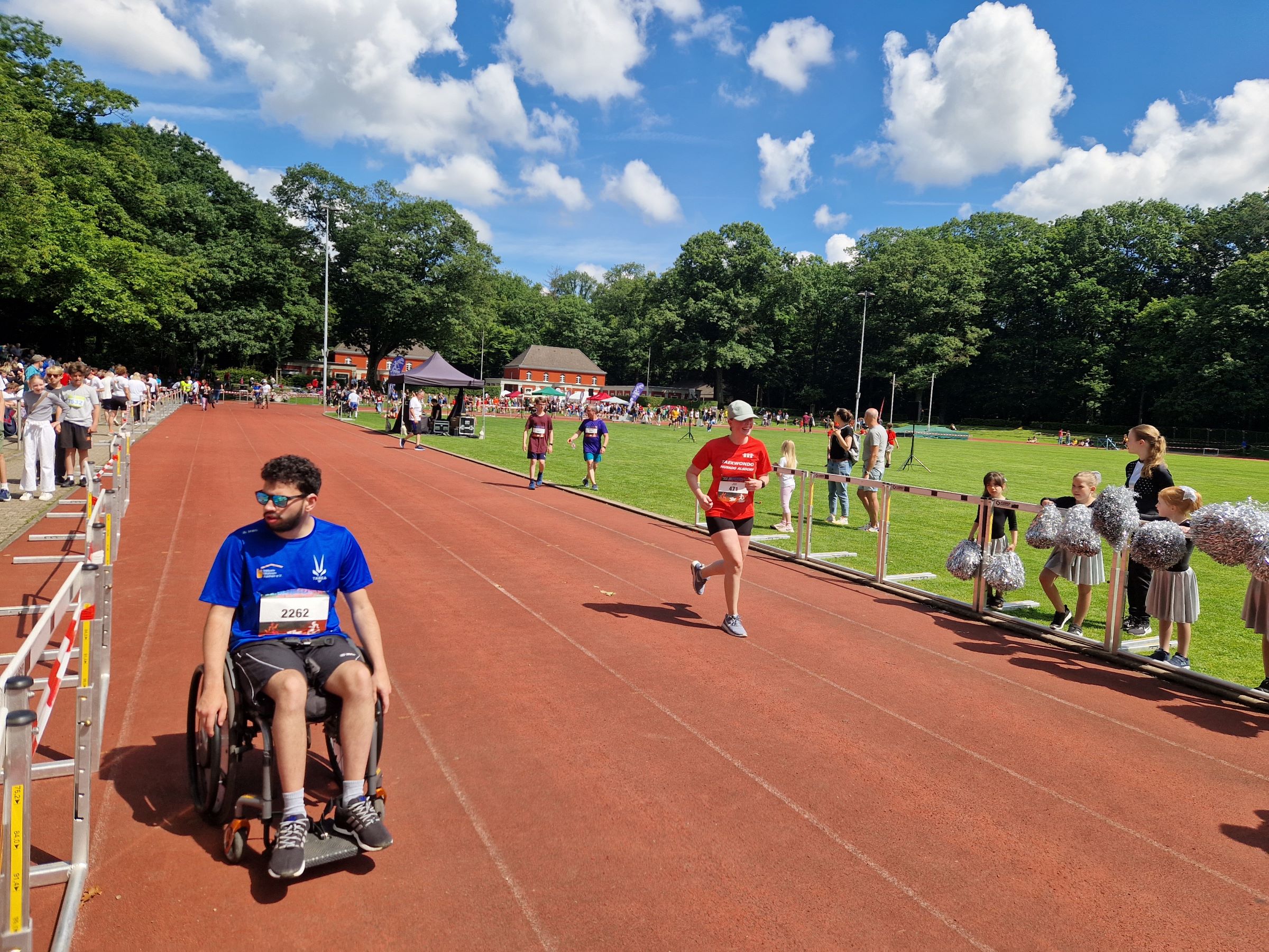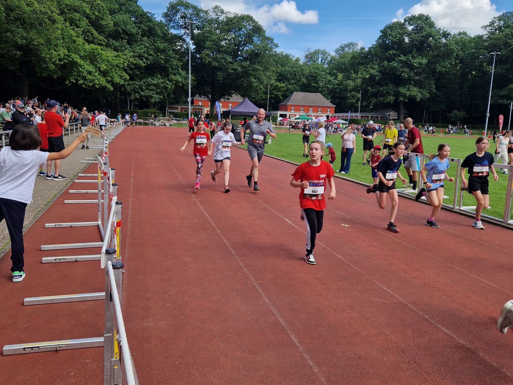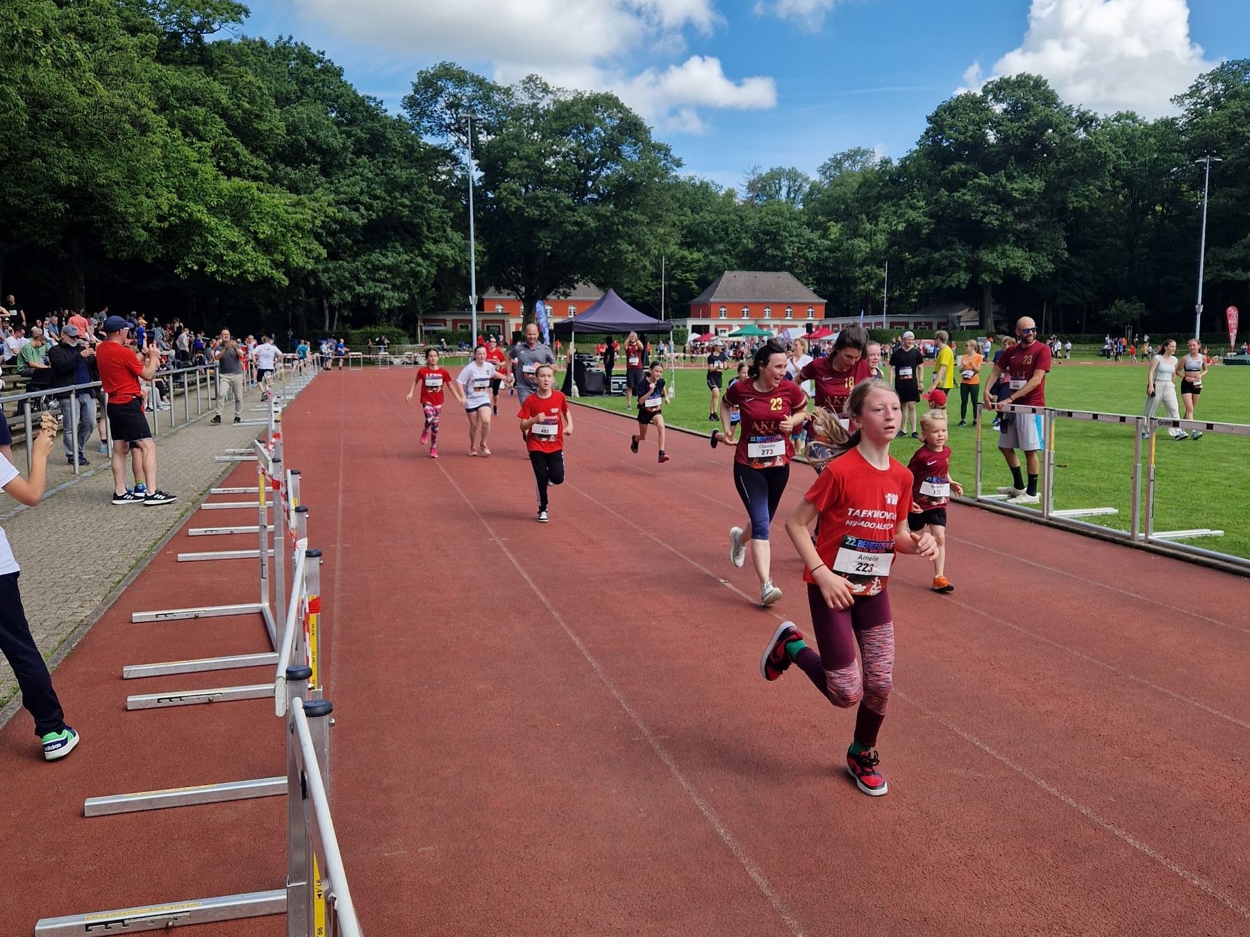 Alles begann um 9:30 Uhr mit der Abholung der Startnummern. Als die Sitzplätze gesichert waren, ging es an die letzten Vorbereitungen. Die Startnummern wurden angebracht, die Schuhe zugeschnürt, der letzte Bissen der Banane wurde gegessen und schon konnte es losgehen. Der Beginn machte, um 10:00 Uhr, der 400m Lauf (eine Runde im Stadion). Hier gingen 2 unserer Jungen Sportler an den Start und konnten mit ihren Leistungen überzeugen. Mia Merkelbach erreichte mit nur 1 Sekunde Rückstand den auf Platz 1 den dritten Platz.
