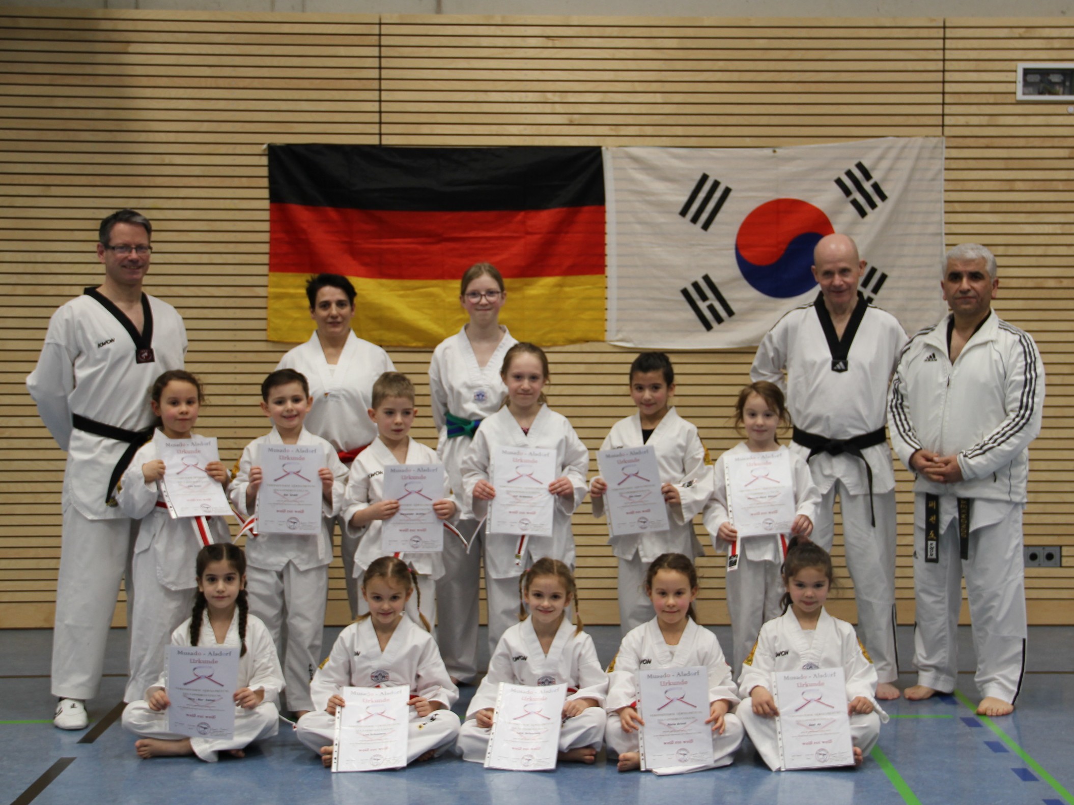 Alle Übungen konnten zur vollen Zufriedenheit der Prüfer Meister Sadettin Özdemir und Meister Fredi Spiertz ausgeführt werden und so konnten die Kinder nach fast 1,5 Stunden Prüfung ihren verdienten neuen Gürtel und der entsprechenden Urkunde in Empfang nehmen.