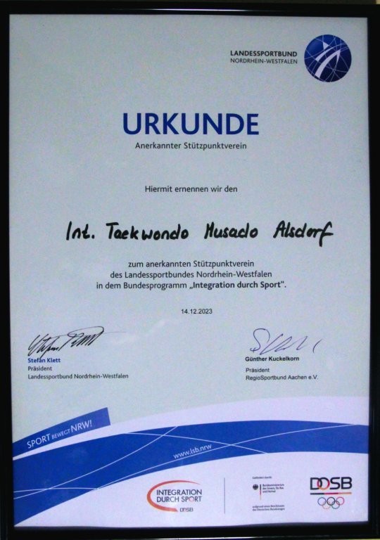Am 2. Dezember 2025 wurde dem Verein Int. Taekwondo Musado Alsdorf durch den RegioSportBund Aachen die Auszeichnung für das Projekt Integration durch Sport überreicht. Frau Selcan Başoğul Yaman, Fachkraft für Integration durch Sport, übergab die Ehrung feierlich vor den Sportlerinnen und Sportlern der Familiengruppe dem Vorsitzenden und Haupttrainer Sadettin Özdemir.