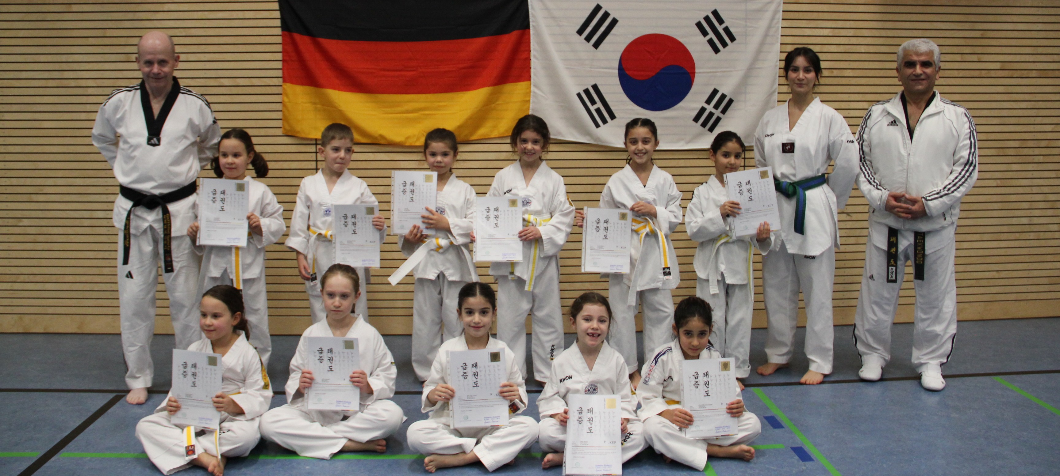 Meisterin Lena Thouet begleitete die Gruppe von Anfang an und legt die Grundlage für die erfolgreiche Vorbereitung. Aufgrund ihres Studiums in England musste sie die Gruppe weitergeben, und Trainerin Dilara Arslanbas übernahm die Betreuung. Für Dilara war es ihre erste Gruppe, die sie bis zur Prüfung führen durfte, und sie ist sehr stolz auf die Entwicklung der Kinder. Gleichzeitig bedankt sie sich herzlich bei Meister Sadettin Özdemir und Meister Fredi Spiertz für ihr Vertrauen, ihr die Verantwortung für die Gruppe zu übertragen.